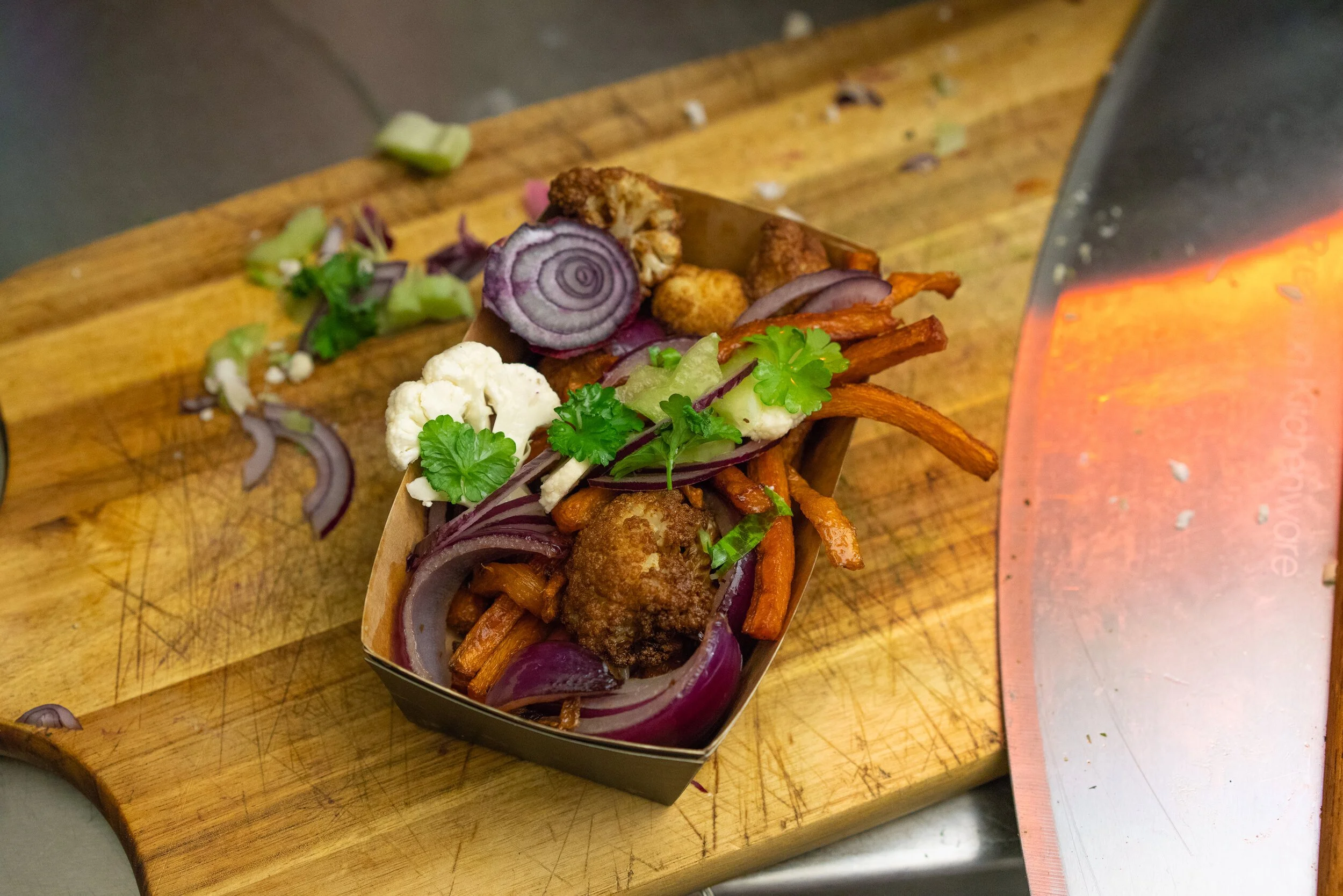 Pommes mit regionalem und saisonalem Gemüse. Das Gemüse wird frisch frittiert serviert.