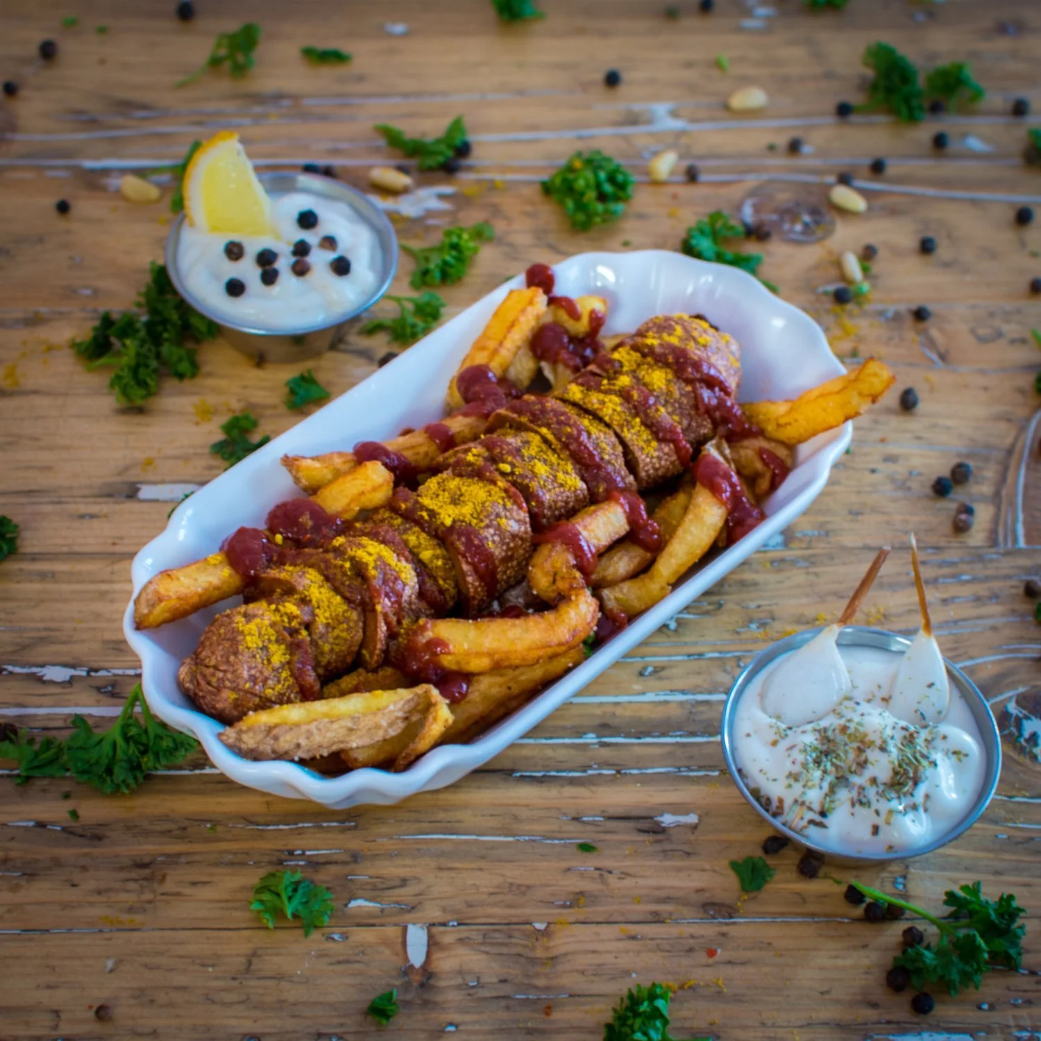 Der Berliner Standart - Vegane Currywurst mit einer Portion frischen Pommes. Dazu Currysauce und geschmorte Zwiebeln.